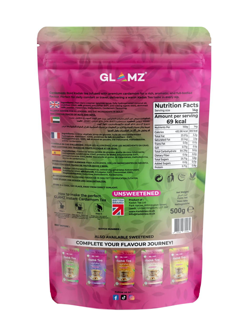 Non-dairy creamer (Glucose syrup, Fully hydrogenated coconut oil, stabiliser: E340, Milk protein, Emulsifier: E471, Anti-caking agent: E551), Skimmed milk powder, Instant tea, Maltodextrin, Cardamom flavouring.