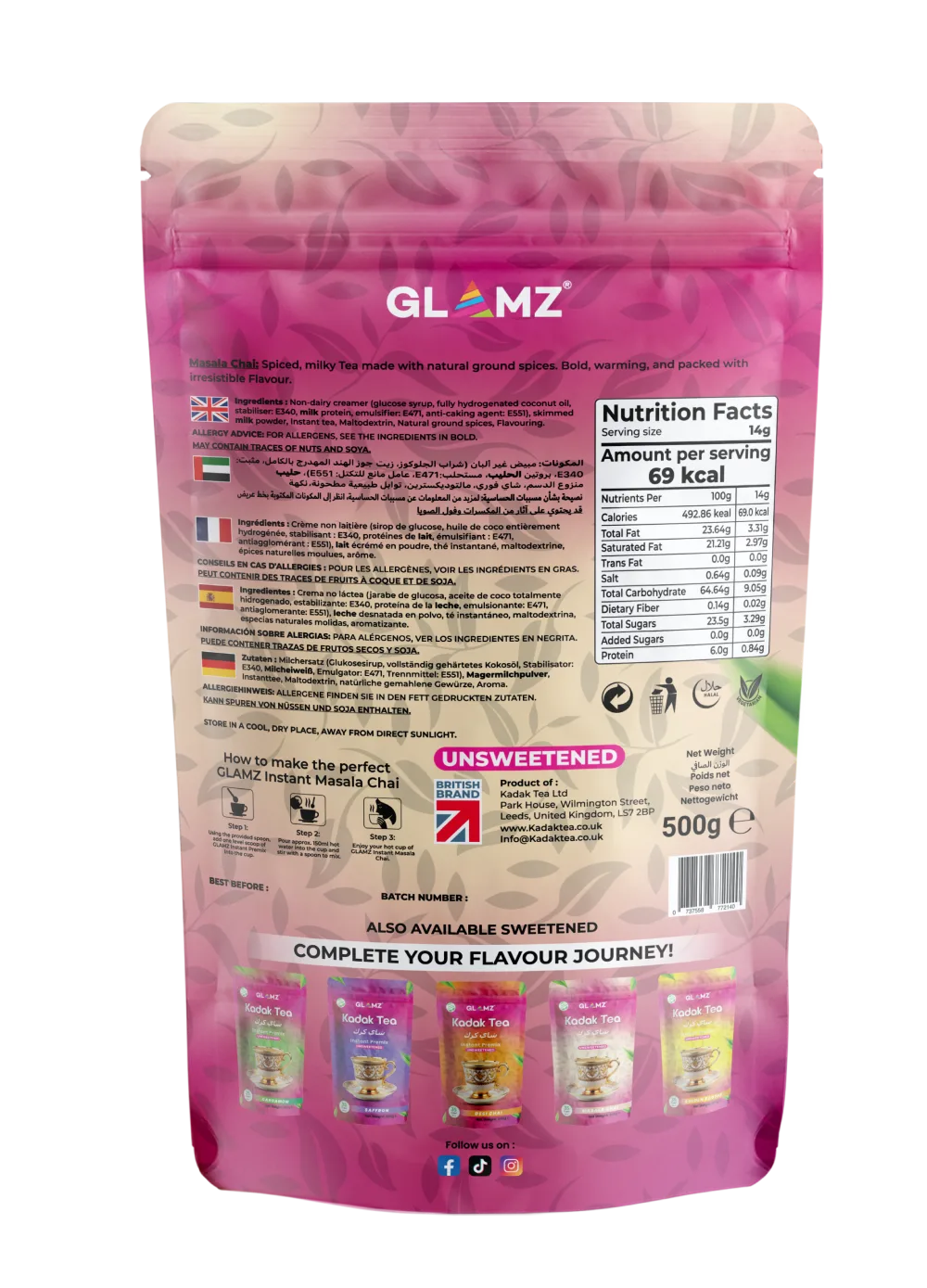 Non-dairy creamer (Glucose syrup, Fully hydrogenated coconut oil, Stabiliser: E340, Milk protein, emulsifier: E471, Anti-caking agent: E551), Skimmed milk powder, Instant tea, Maltodextrin, Natural ground spices, Flavouring